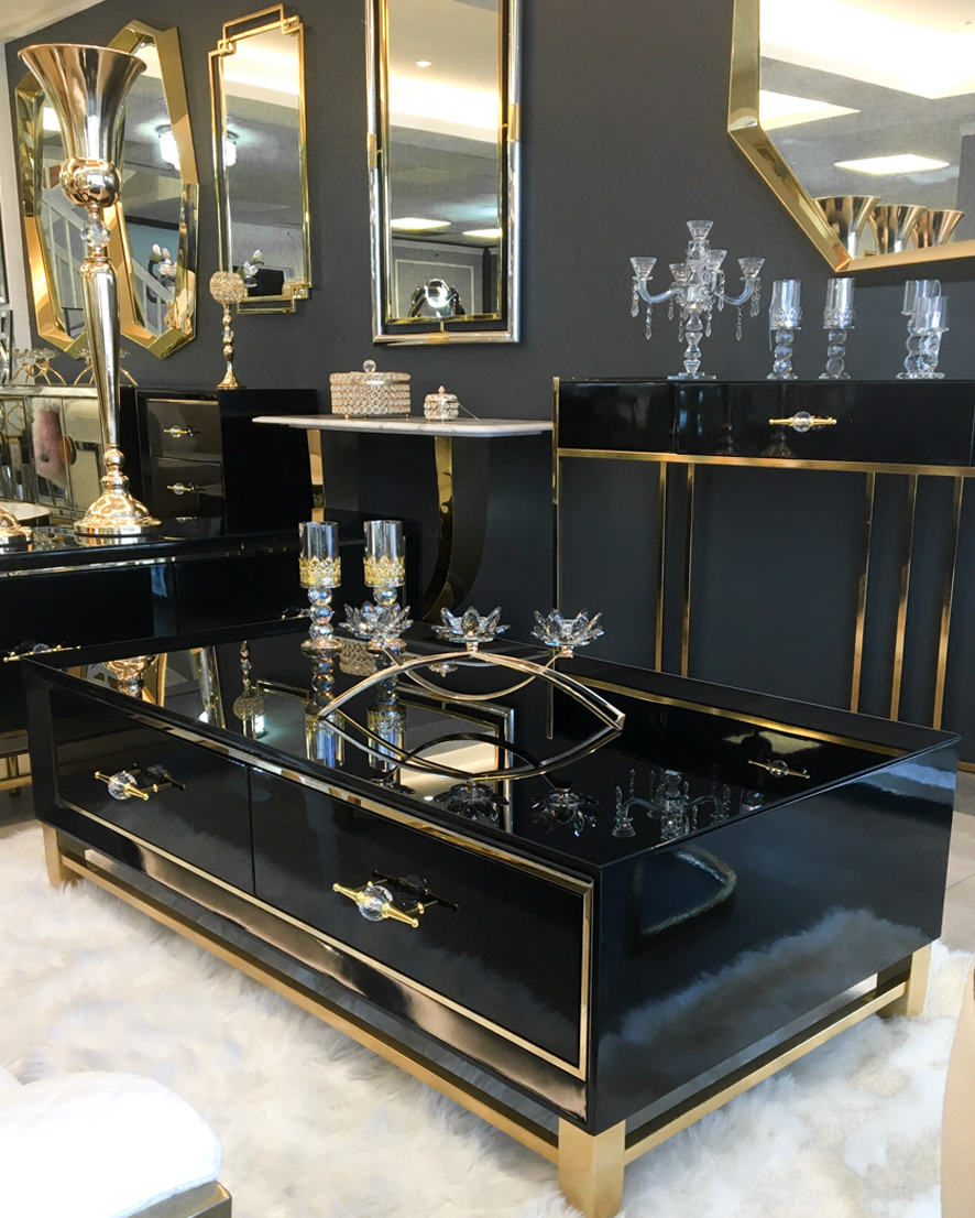 Lacado negro brillante, Cubierta cristal templado negro. Detalles en dorado.